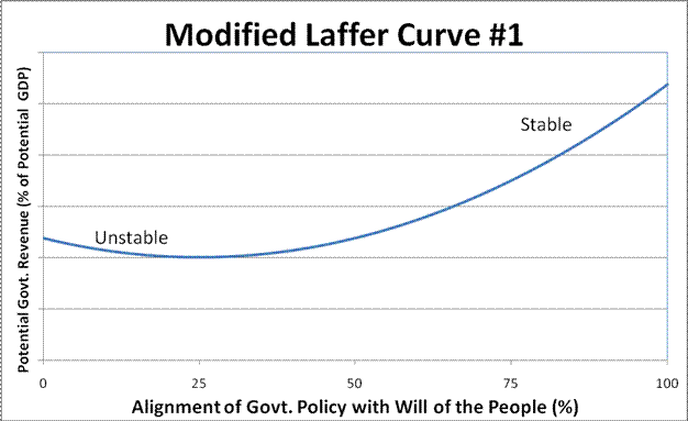 I will now introduce a significant variant of the Laffer curve. In such graph, the x-axis is a measure of the alignment of government policy with the will of the population and the y-axis is percent of GDP made available for current “government” programs. I contend that, on the side of the graph whereby government policy is NOT aligned with the Will of the people (i.e. dictatorship, oligarchy, etc. – highly unstable), potential revenue can be locally (not globally) maximized through the imposition of brute force whereby the taxed classes are intimidated into not questioning / challenging “the system” because it is too powerful to oppose for the expected benefit to be derived from such opposition (see discussion of Opportunity Cost below). I alternatively contend that, on the side of the graph whereby government policy is aligned with the Will of the people (i.e. true representative democracy - highly stable), potential revenue can be globally maximized at immensely higher levels through the mutually pledged cooperation of the various factions of the population for the purpose of improving society for the mutual benefit of all citizens.