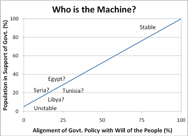 Also, I present a graph of “Who is the Machine?” in terms of population. As alignment of government policy with the Will of the People decreases, the individuals who make up “the Machine” is minimal containing only those in control of the Machine and those significantly benefitting from the Machine; this represents a government subject to considerable instability. As alignment of government policy with the Will of the People approaches 100% (remember the national unity experienced following 9/11/01), the Machine consists of nearly the entire population; and government is extremely stable.