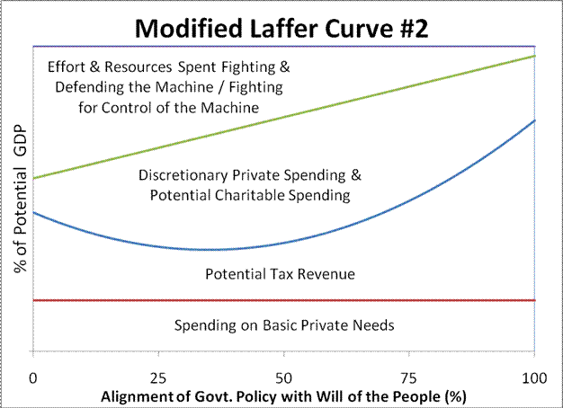 I now present a further variant of the Laffer curve in which the following have been added to the previous graph: (1) basic private needs; (2) discretionary private spending & potential charitable spending; and (3) effort & resources spent fighting & defending the machine and/or fighting for control of the machine. Note that unemployment results in an overall shift of each of the curves downward resulting in a decreased standard of living for everyone.